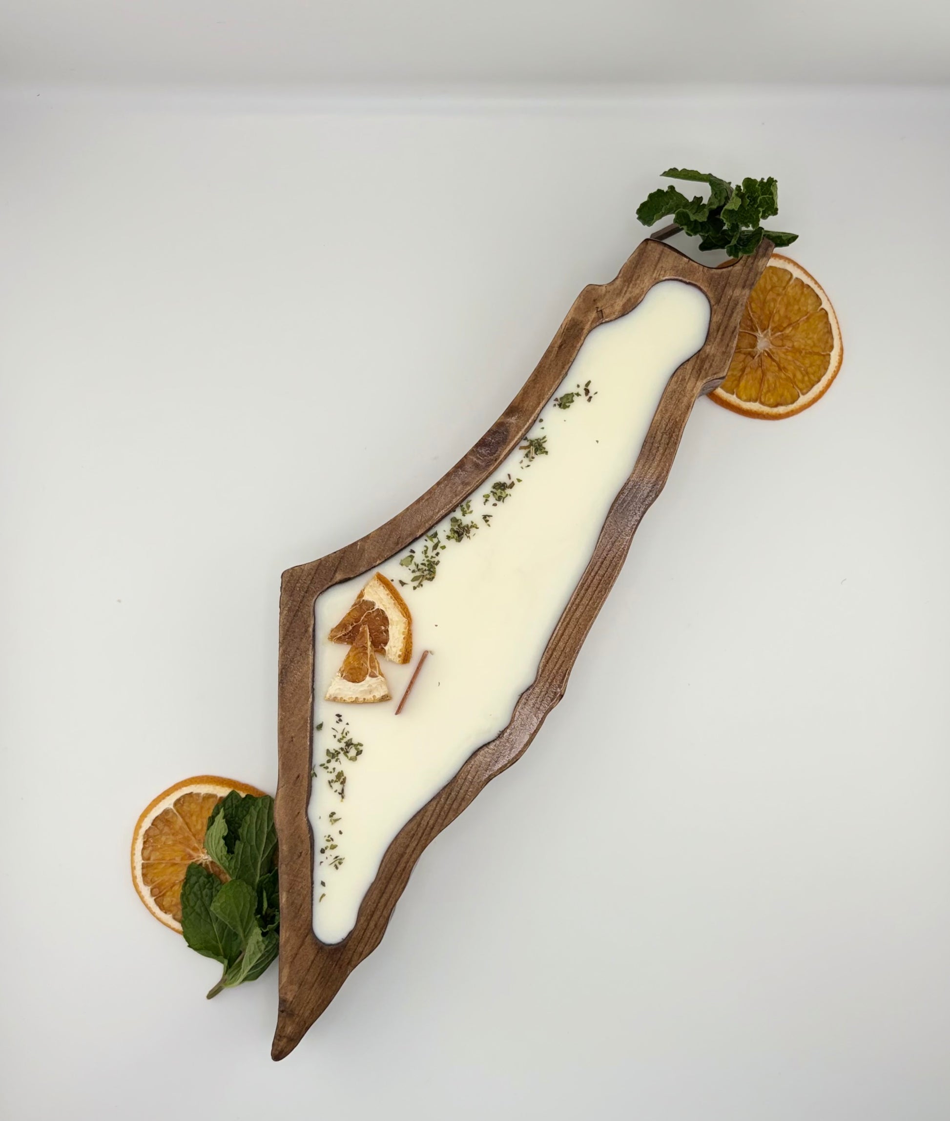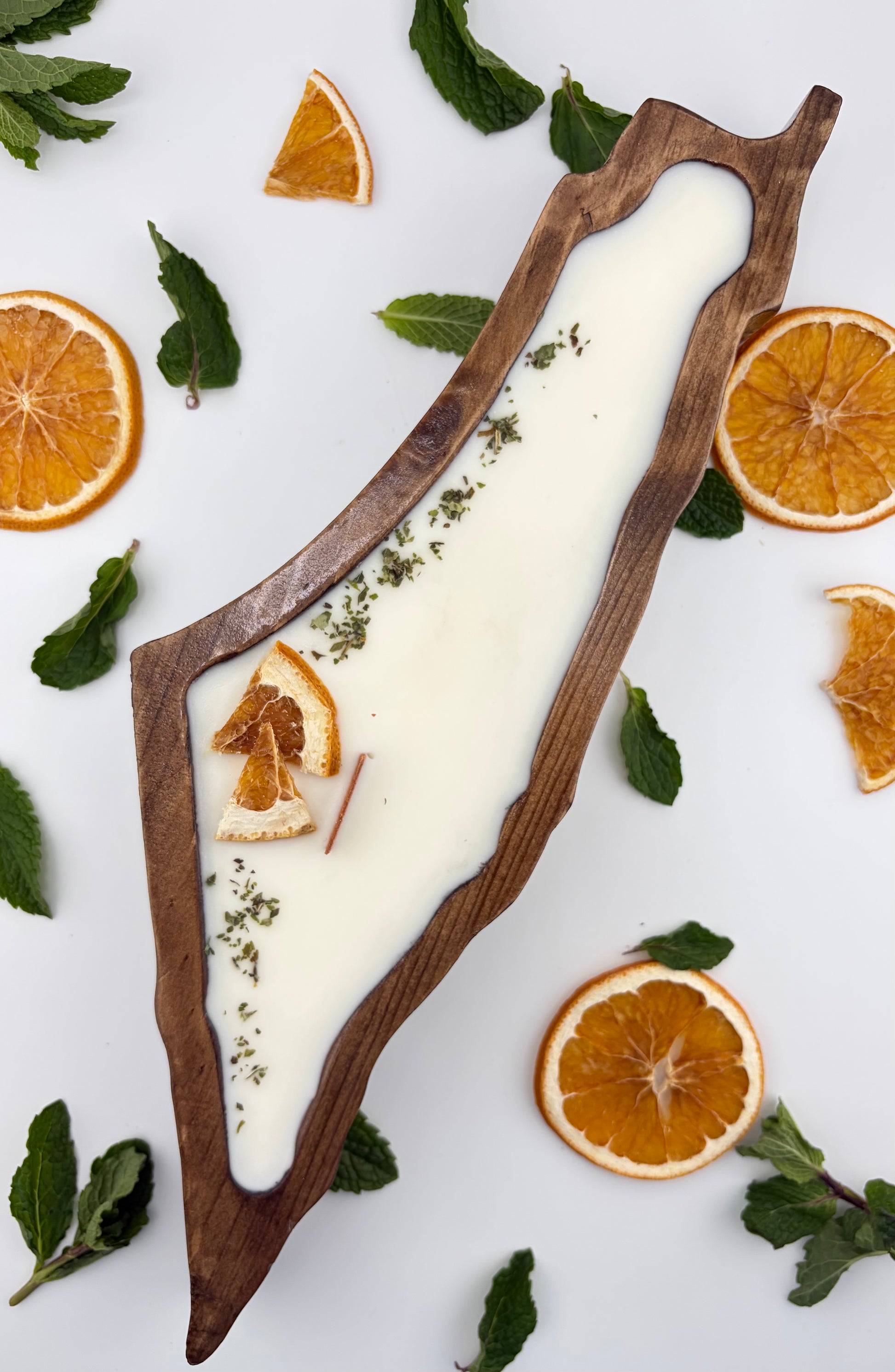 Introducing our exclusive Palestine map shaped Candle, meticulously crafted to evoke a sense of artistry and heritage. Each candle is adorned with a wooden replica of Palestine's map, imported from Ramallah, Palestine, and carefully hand-poured in Florida.